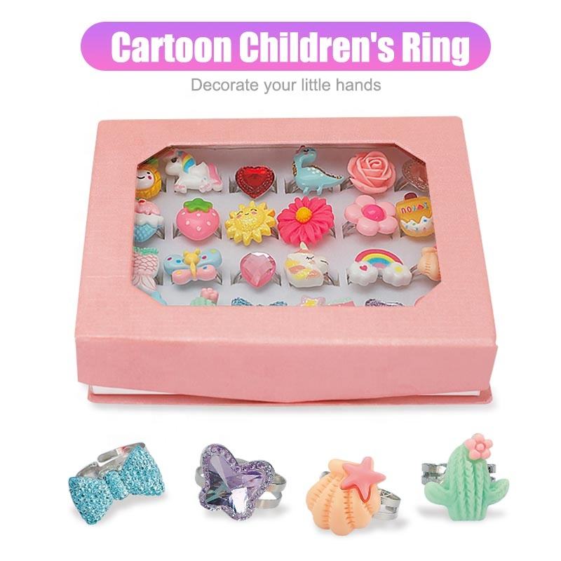 24 Ring Toys and a Pink Jewelry BoxOne hand adorned with four adorable ring toys of different designsOpen rings can be adjusted to fit the finger size 24 Colorful Ring Toys in Different StylesA little girl in a red dress holds out all ten fingers to show off her Ring Toy
