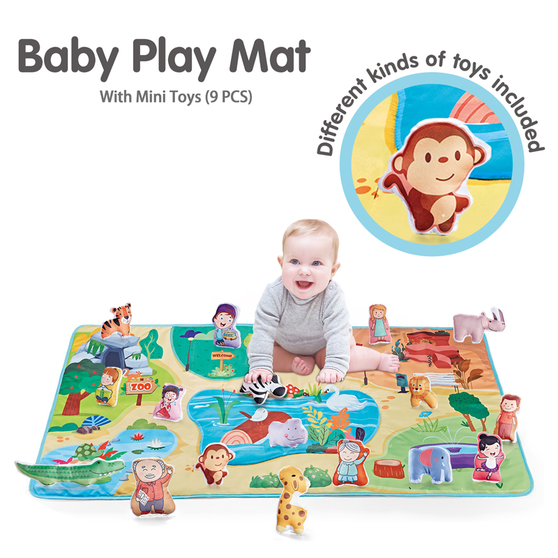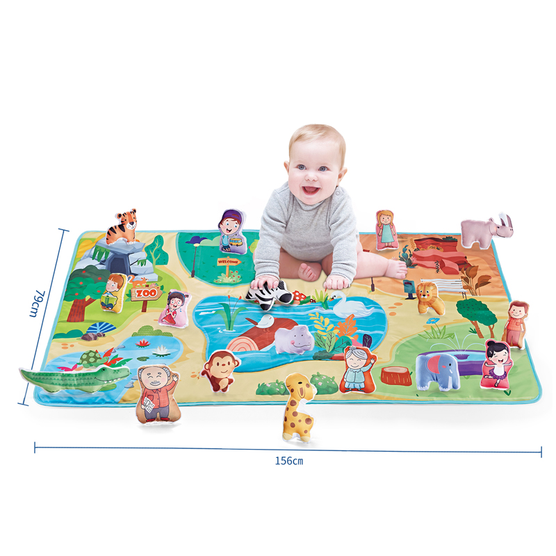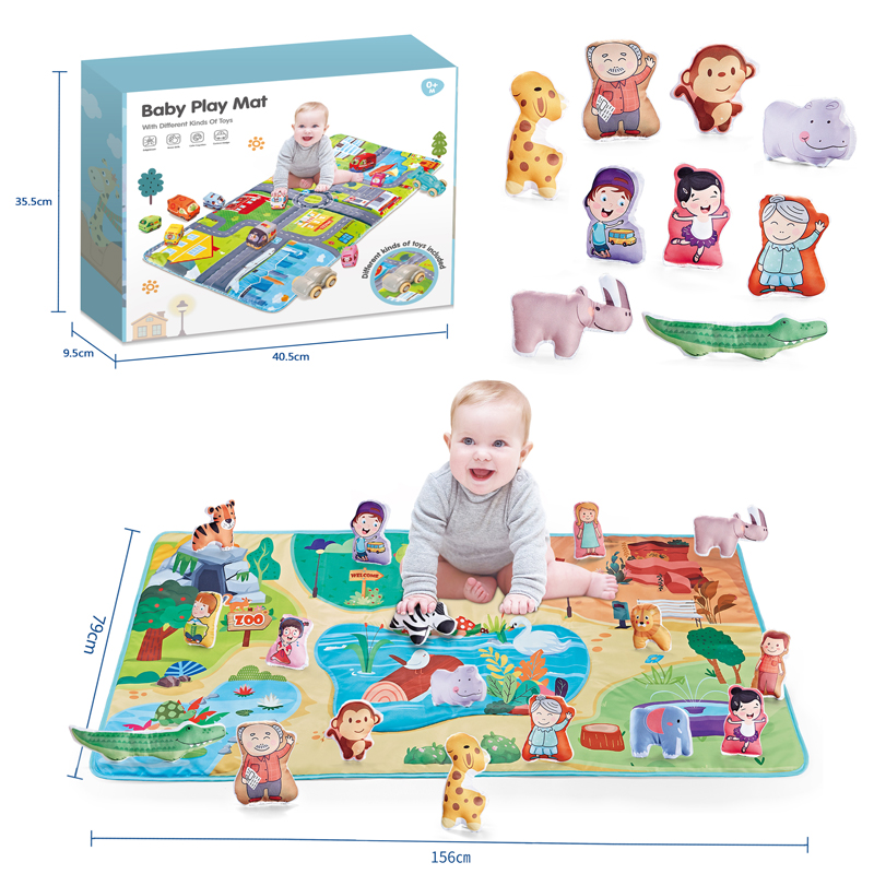 A child in gray clothing sits smiling on the Baby Play Mat, playing with a zebra toy in his hand The Baby Play Mat toy set includes a variety of different toys, such as people and small animals Product Dimensions of the Baby Play Mat Toy Baby Plat Mat Toy and Baby Plat Mat Product Outer Packaging Dimensions In a warm-toned children's room, a child dressed in gray sits smiling on a Baby Play Mat, playing with a zebra toy in their hands