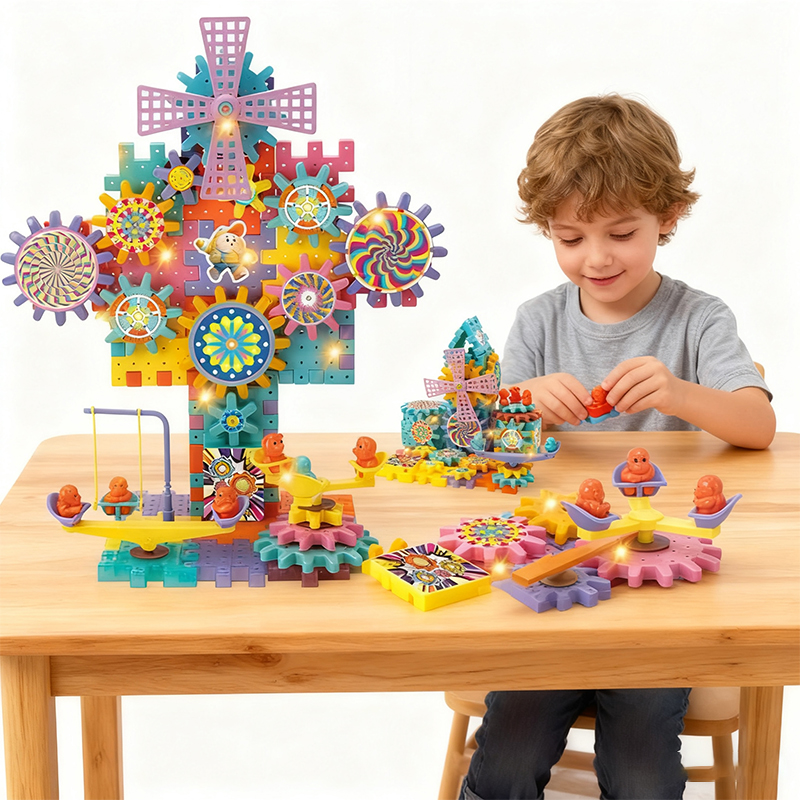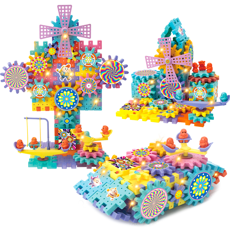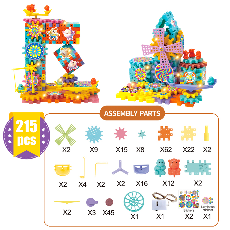 Three colorful, light-emitting DIY Electric Building Blocks assembled into different shapes A little boy in gray clothes sat smiling at the table, assembling his DIY Electric Building Blocks toy DIY Electric Building Blocks can be applied with glow-in-the-dark stickers for a night-glow effect DIY Electric Building Blocks includes 215 accessories and displays all components found in the toy DIY Electric Building Blocks Flip the switch and the gears will start turning automatically. You can also rotate the internal components to make other gears spin Dimensions of the outer packaging for DIY Electric Building Blocks
