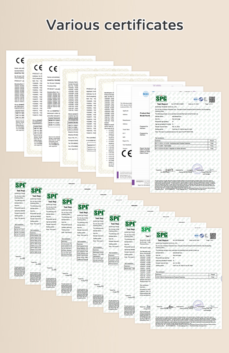 Yes, we provide product testing reports for most toys to ensure they comply with international safety and quality standards such as ASTM, HR4040, CE, ROHS, GCC…etc. These reports are conducted by certified third-party laboratories. In addition, we also have ISO9001, ISO14001 certificate and BSCI factory inspection report. If you need them, please let us know and we will be happy to provide them.