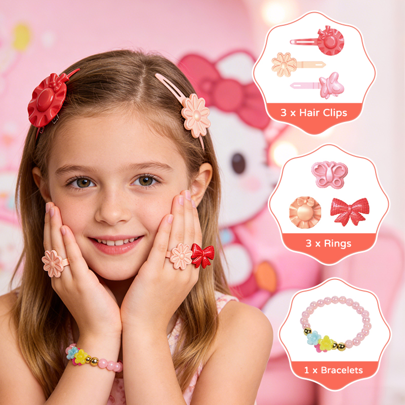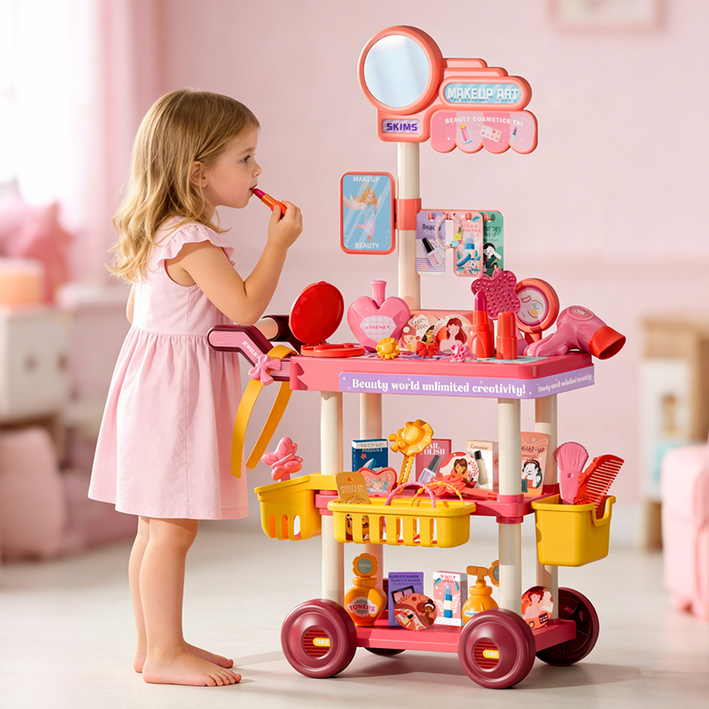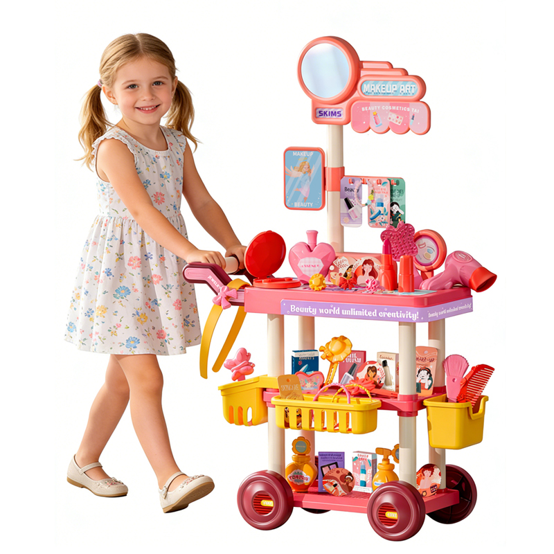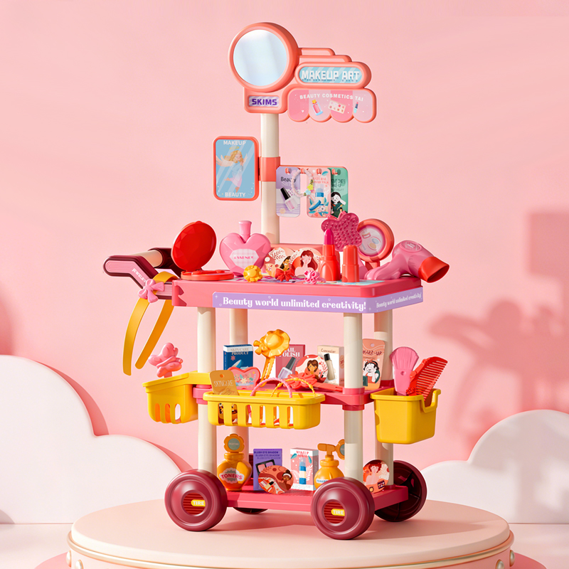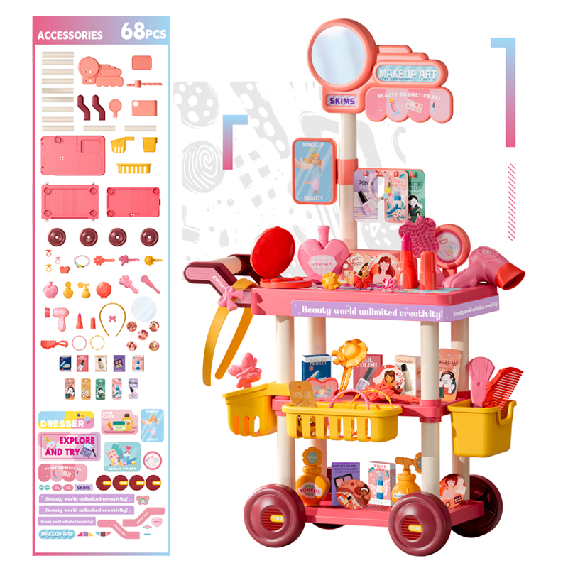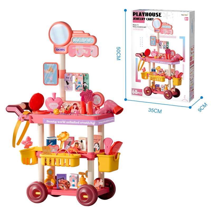 Pink Jewelry Cart Play House Toys 67pcs A little girl wore a bracelet, three rings, and a hair clip on her handA little girl applies lipstick in front of a pink Jewelry Cart Play House Toys A little girl pushes a pink jewelry cart playhouse toyPink Jewelry Cart Play House Accessories Display Dimensions of the Pink Jewelry Cart Play House Toys and its Outer Packaging