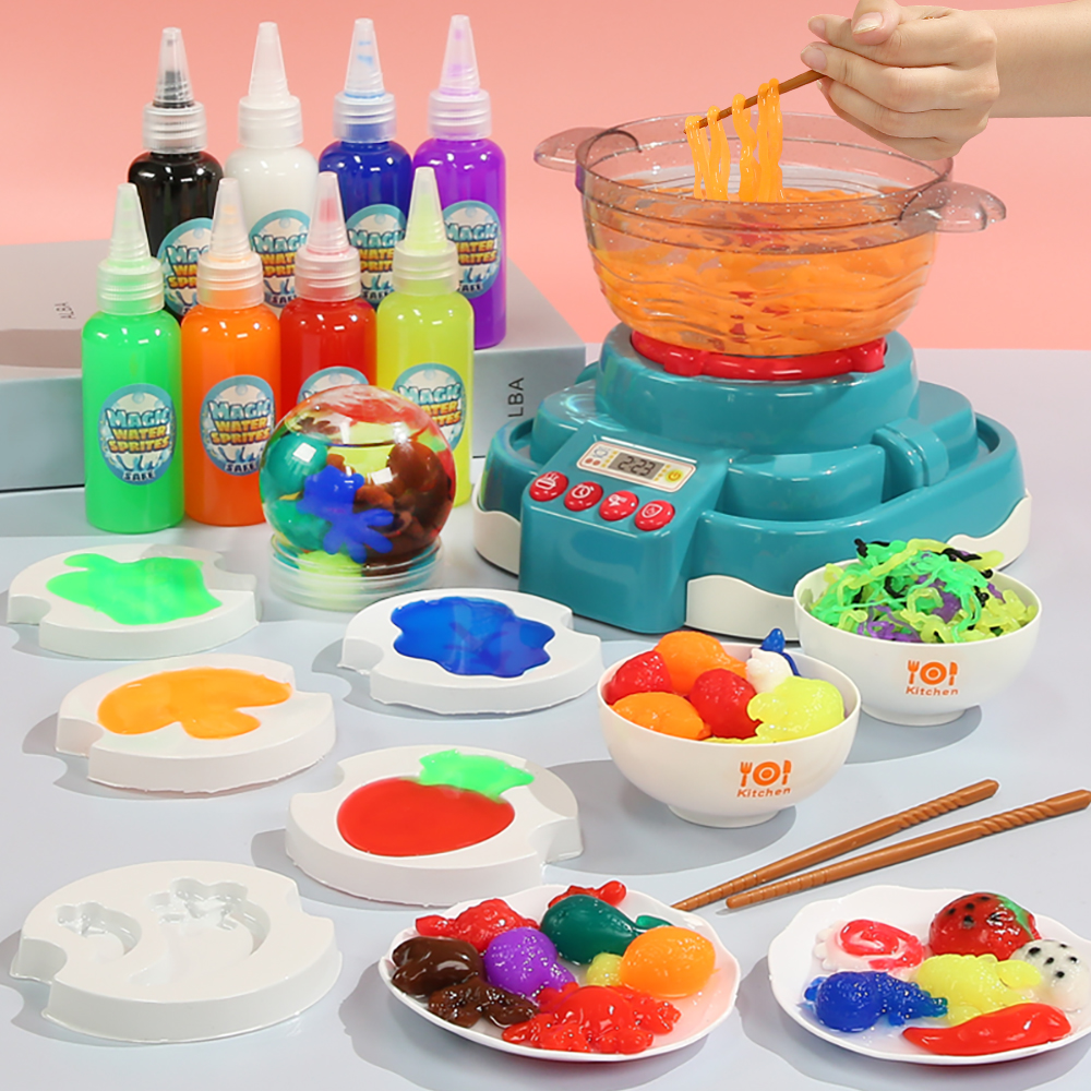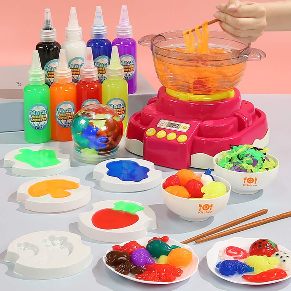 A little girl smiles as she plays with the Magic Hot Pot Water Spirit Set, holding chopsticks in her hand A pair of hands cradles the safe, gentle, and non-irritating calcium lactate powder. Stickers of various ingredients are placed on the toys The sound and light effects of the Hot Pot Magic Water Sprite toy simulate the bubbling of a real hot pot Water Spirit Quick 3-Second Demolding and Immersion in Water Place water spirits of various colors into different 3D molds for shaping