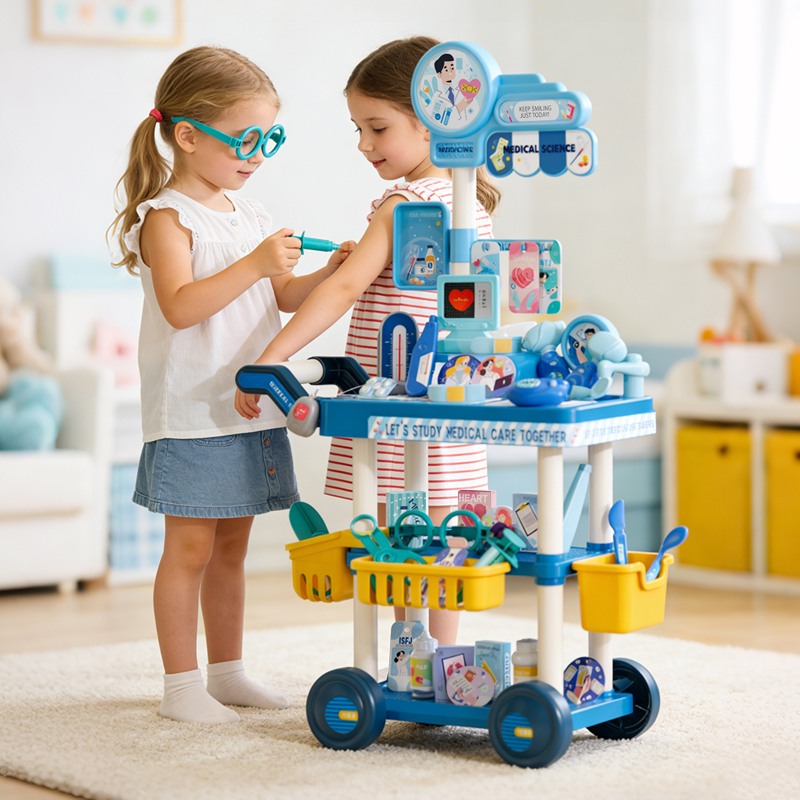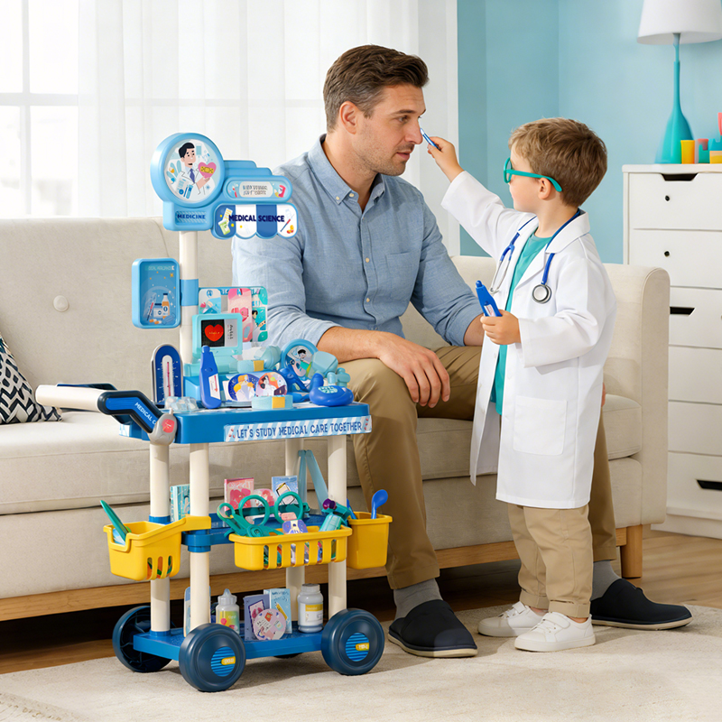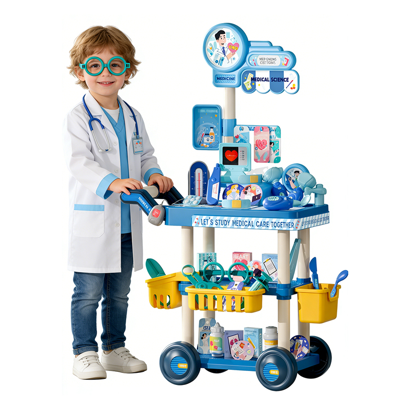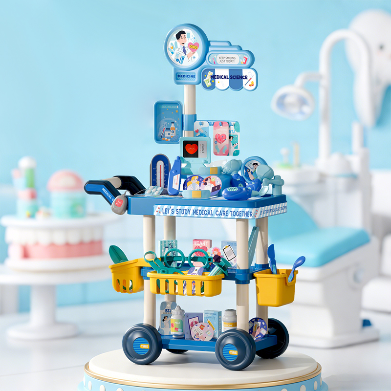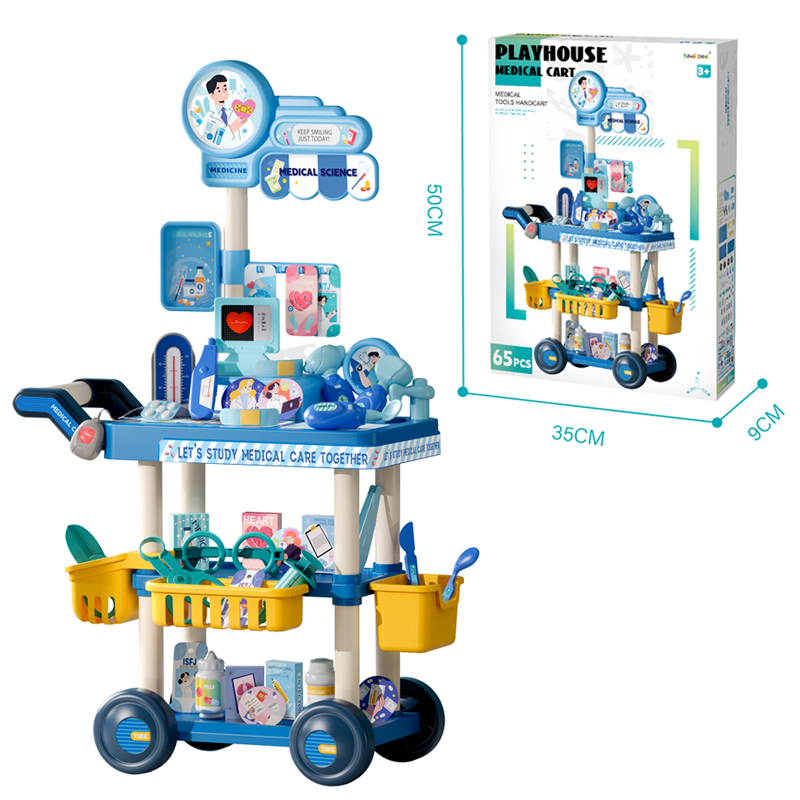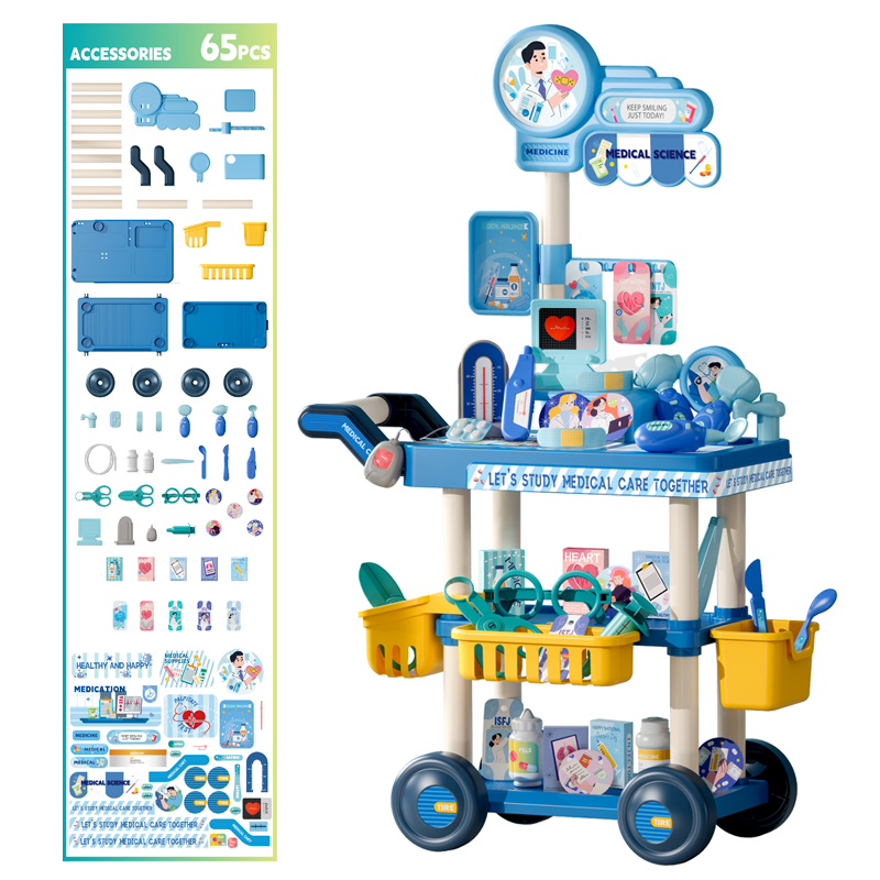 Blue Medical Cart Play House Toys 65pcs Two little girls were playing house next to the Medical Cart Play House ToysA child dressed as a doctor was playing house with his father A child dressed as a doctor pushes a medical cart playhouse toyAccessories Display for Medical Cart Play House Toys Dimensions of the Medical Cart Play House Toys and the outer packaging
