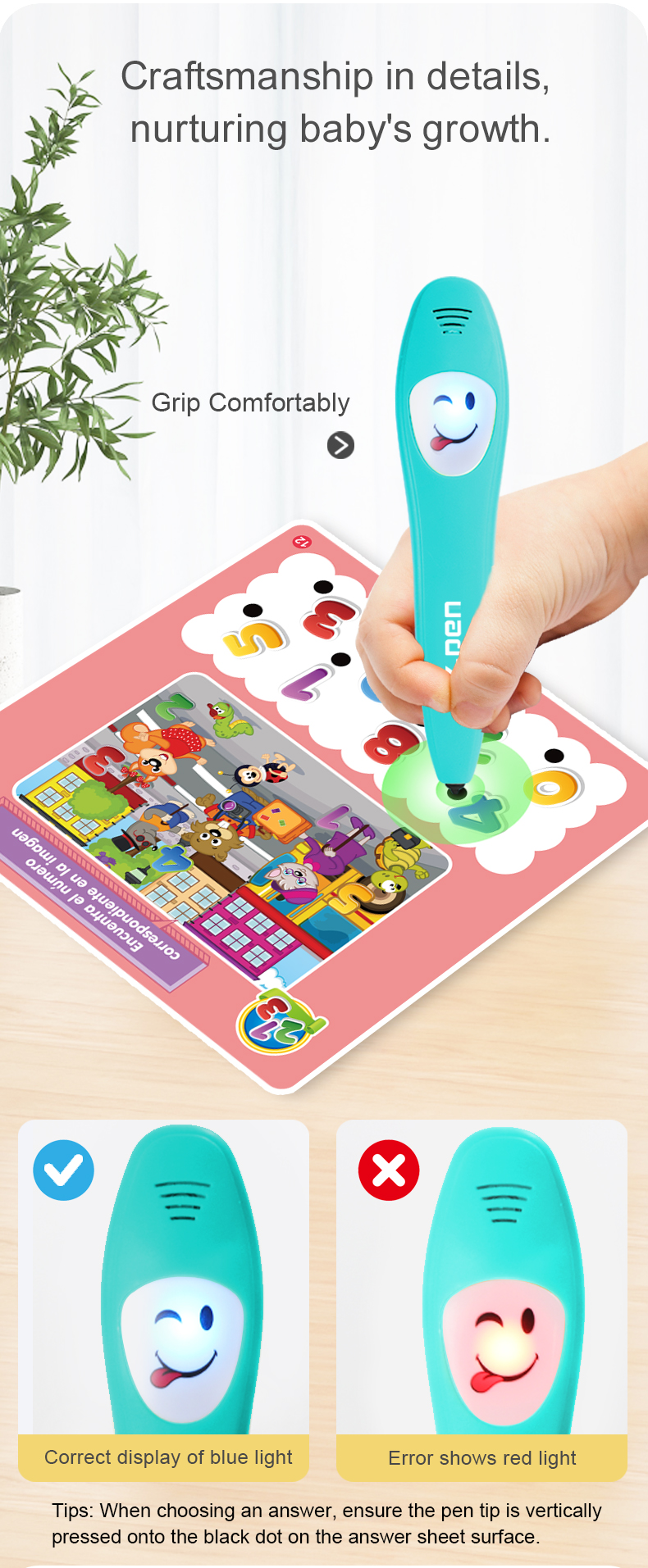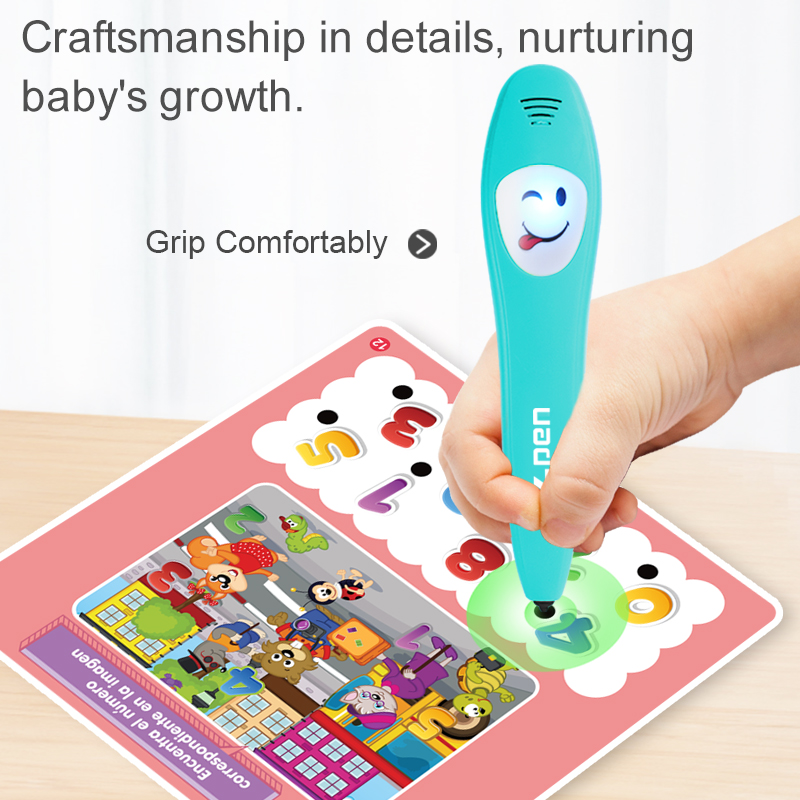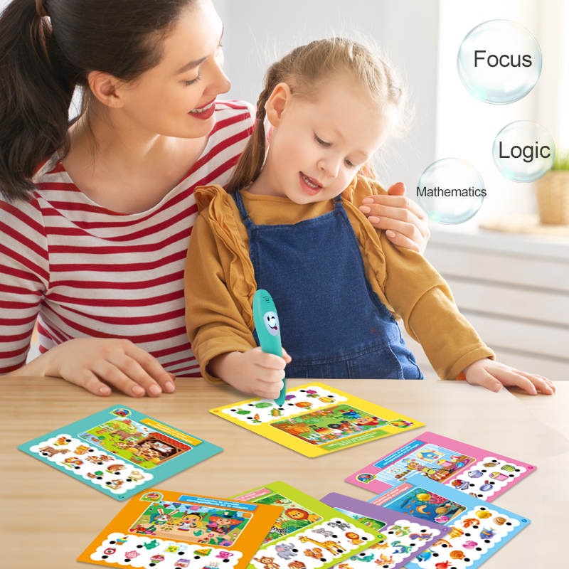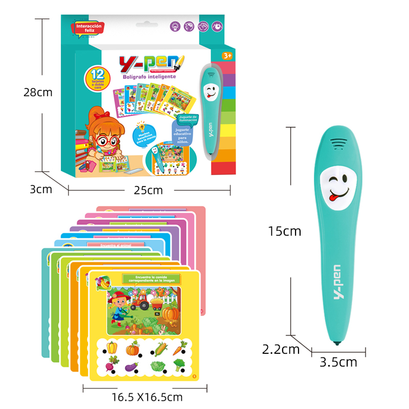 Spanish Early Learning Intelligent Logic Learning Pen features sound and light effects to help children learn independently The Spanish Smart Learning Pen enables separate training for the left and right brain Using the Spanish Smart Learning Pen helps the brain recognize different types of things The mother held her child in the room and taught them to learn using a Spanish smart learning pen Battery Instructions and Feature Details for the Spanish Early Learning Intelligent Logic Learning Pen The Spanish Smart Learning Pen product includes 12 cards with extensive content Dimensions of the Qingse Smart Learning Pen, Learning Cards, and Outer Packaging